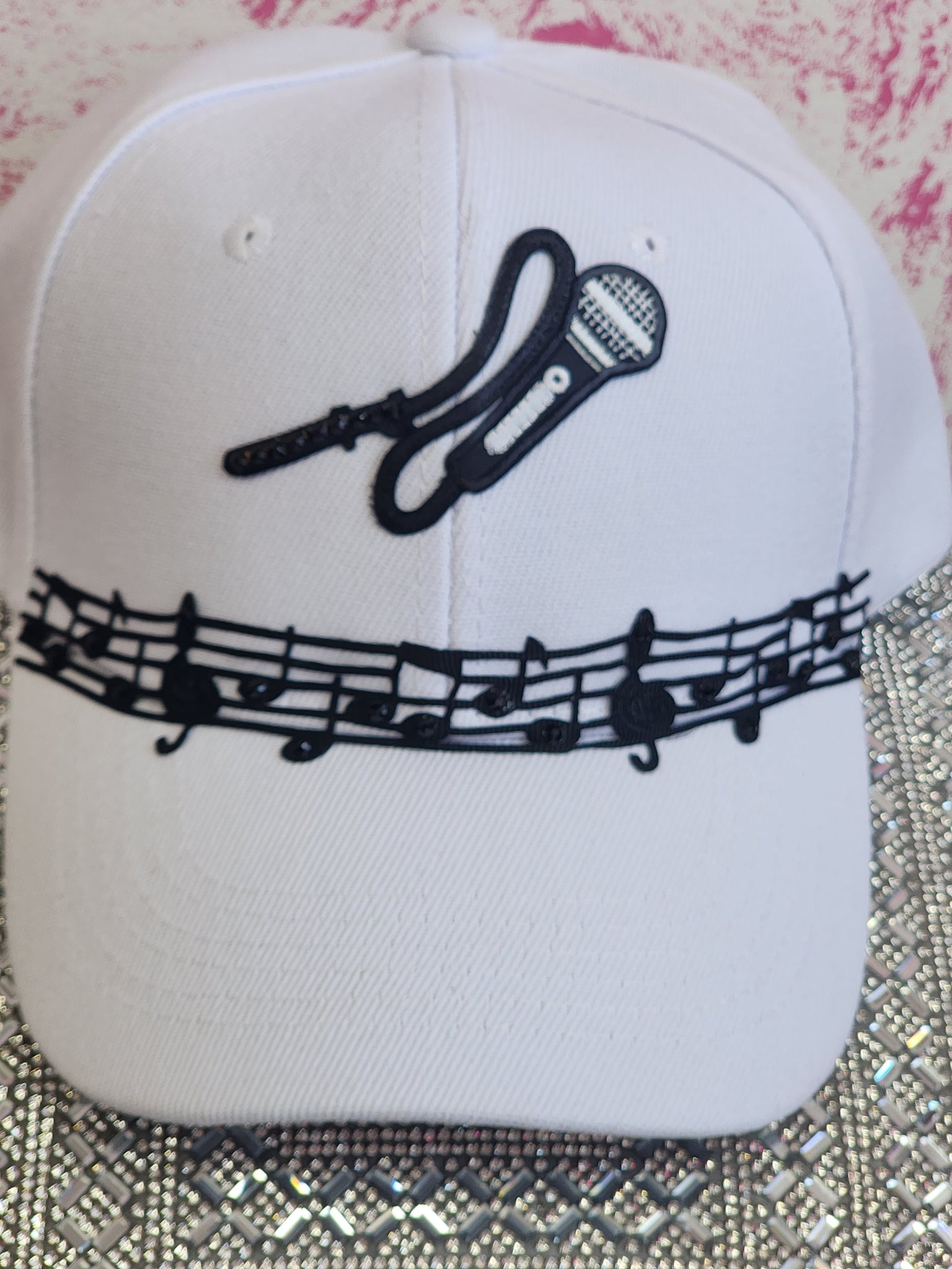 Hit the streets with style in this white baseball cap that truly rocks. A sleek black musical ribbon wraps around the brim, sparkling with black rhinestones for a touch of shine. At the center, an embroidered microphone adorned with black rhinestones steals the spotlight, making this cap a perfect statement piece for music lovers with flair.