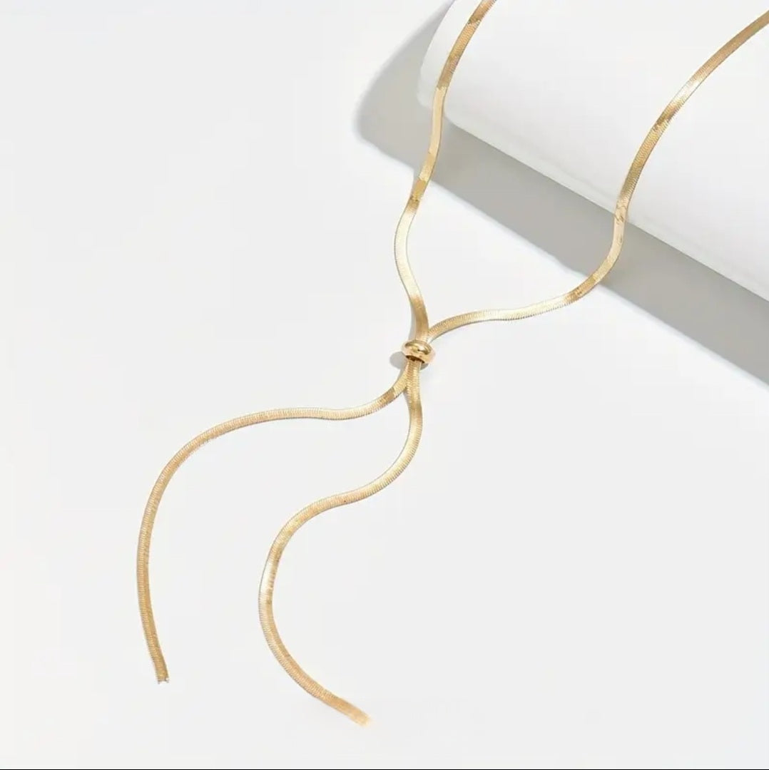 Gorgeous stainless steel Y-shaped Necklace. Flat snake bone chain with adjustable drawstring, making this necklace very versatile.