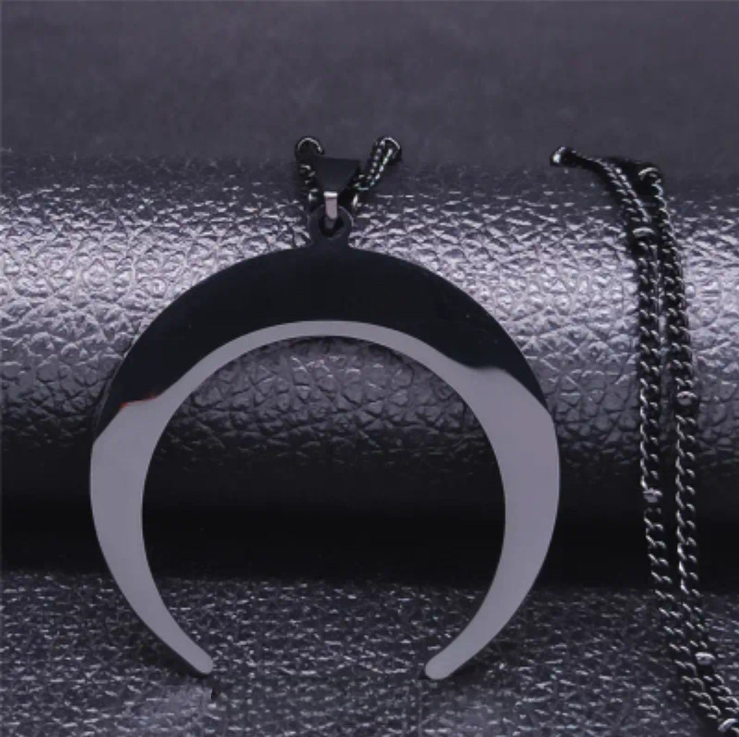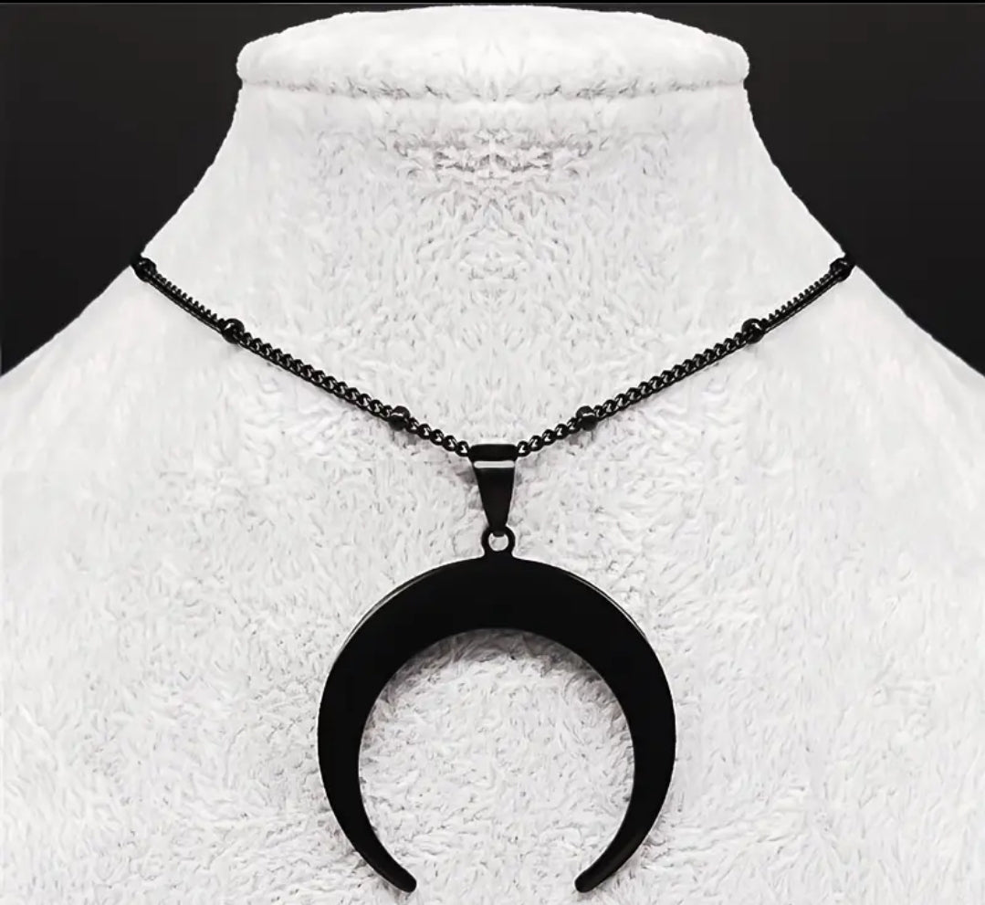 Beautiful celestial half moon pendant, hangs from a 19.69 inch black stainless steel beaded chain.