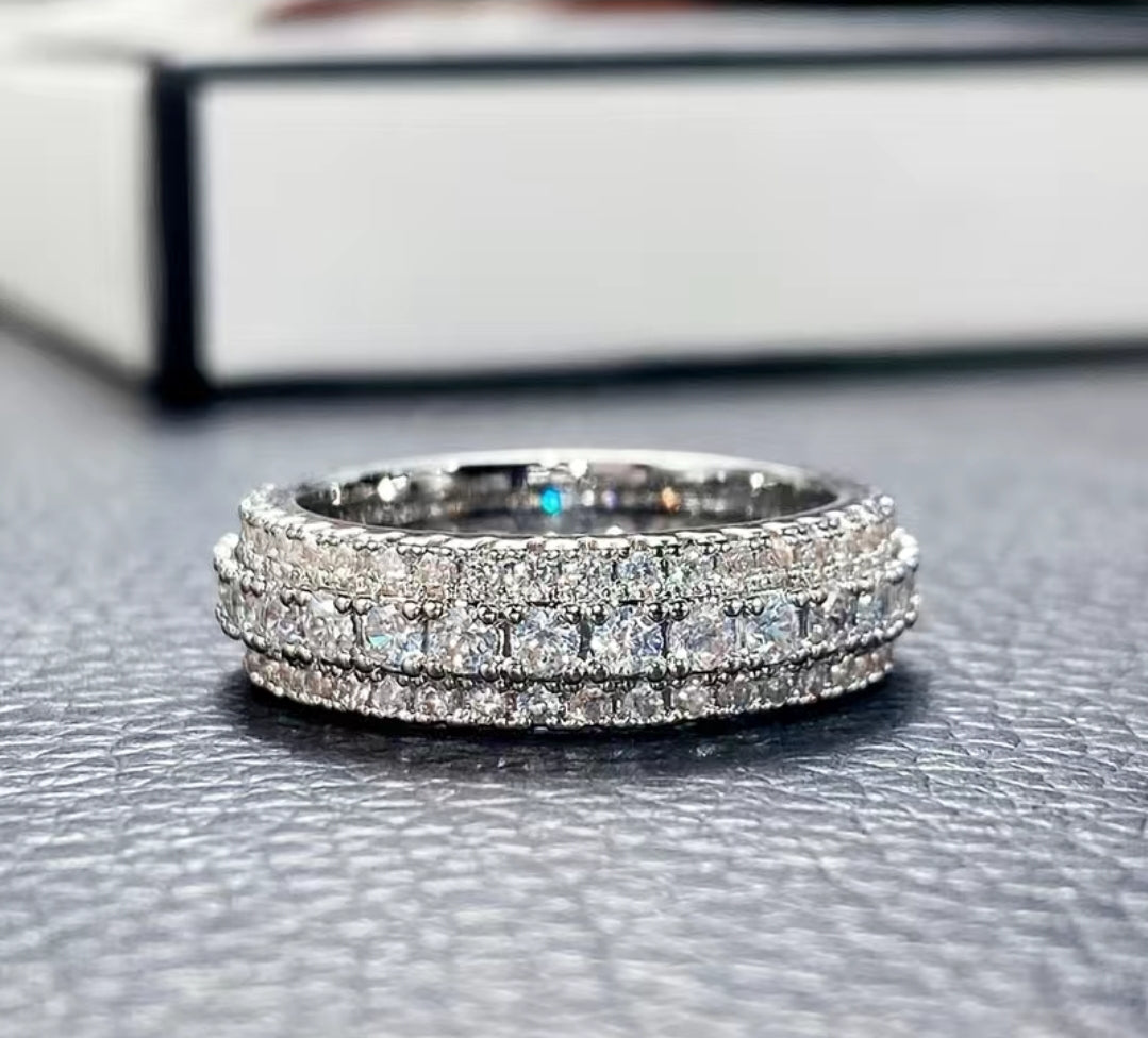 Stylish and modern this unisex zircon band will definitely make a statement. 3 rows of brilliant round cut zircon stones set in a silver plated band.