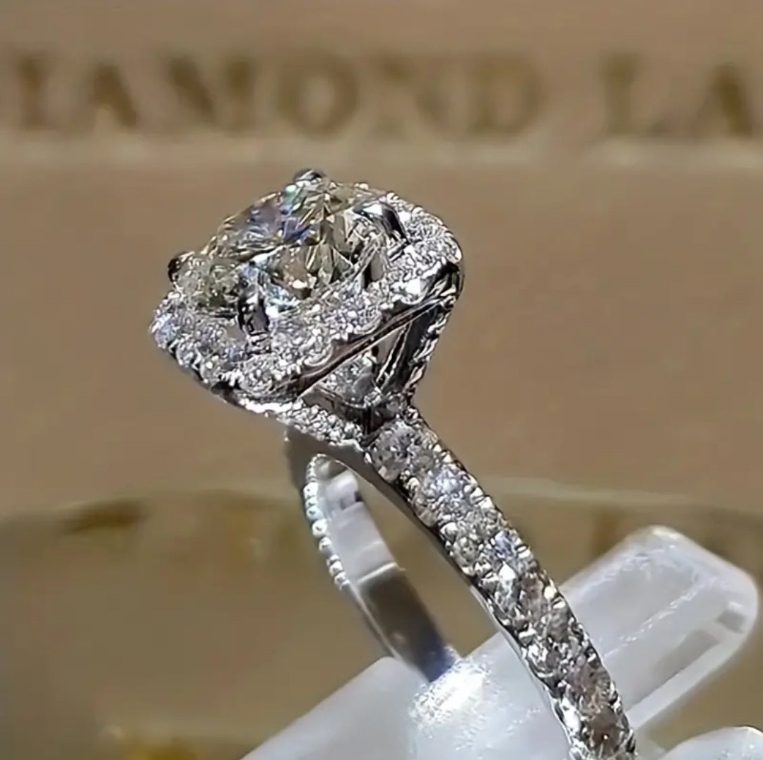 A round cut zircon stone inlaid in a high silver plated setting is surrounded by small zircons giving a halo effect. Sparkly small round zircons decorate the shanks on each side of the center stone. Great for everyday wear.